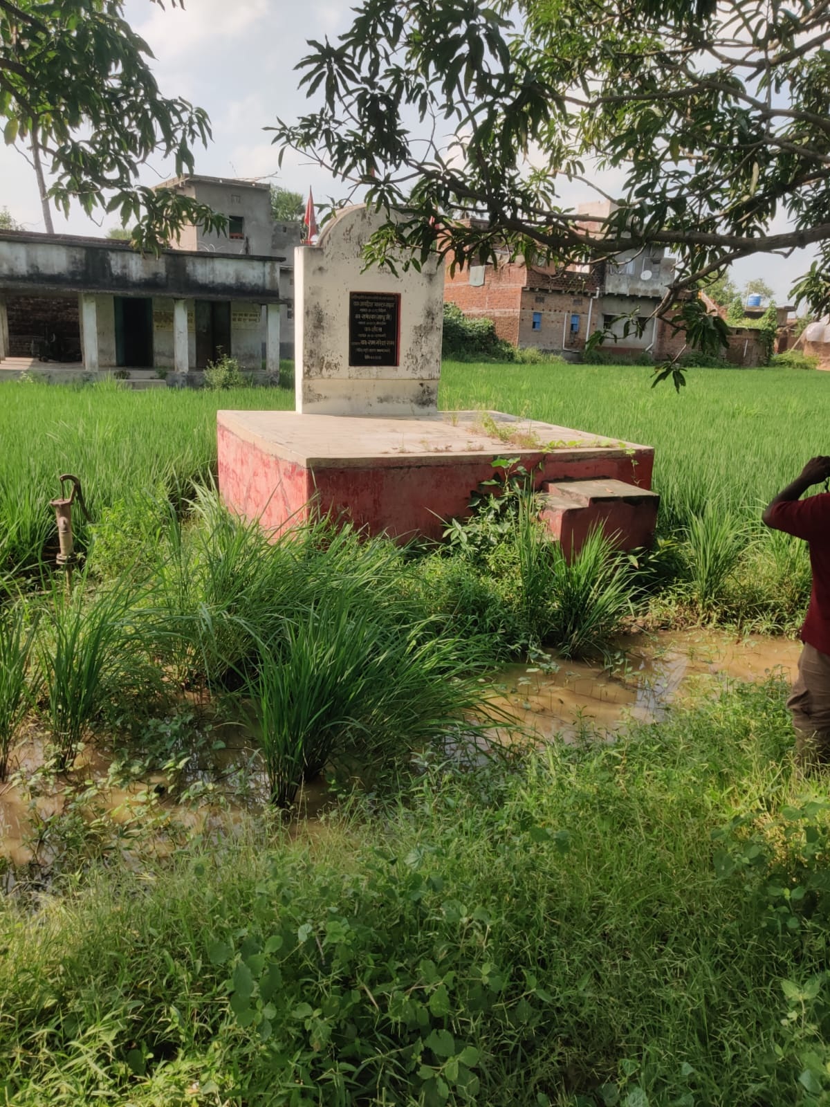 हम अपनी यात्रा के अंतिम पड़ाव की तरफ अग्रसर थे। जिस चौराहे पर मदन साह की दुकान है, वहां से दक्षिण में एक पतली सड़क जाती है। इस टोले में कोइरी जाति के लोग रहते हैं। हमारे साथ बैजू यादव थे। सड़क के पश्चिम में हमें एक स्मारक दिखा, जिसमें जगदीश मास्टर, रामेश्वर अहीर (साधु जी) और कॉमरेड शीला के शहीद होने की जानकारी लिखी गई है। यह स्मारक एक खेत में है, जहां तक पहुंचने का एकमात्र तरीका कीचड़ को पार करना है।