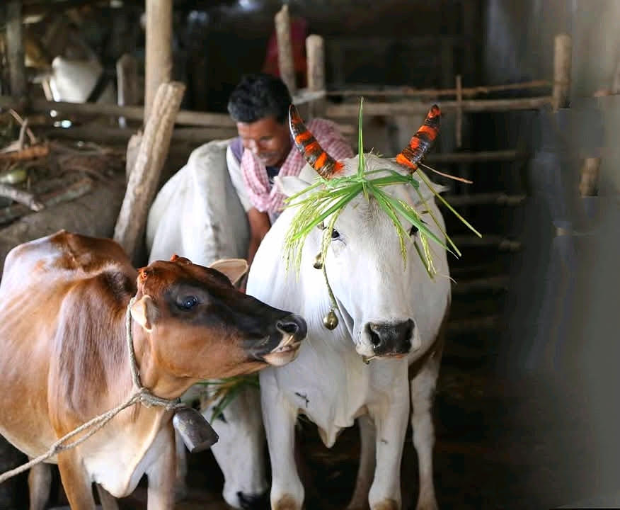 लेकिन, जब फसल आई तो बूढ़े ने उन पशुओं को एक दाना भी खाने को नहीं दिया। हमेशा की तरह वही रूखी-सूखी घास डाल दी। आहत होकर गाय और उसके बछड़े जो बैल बन चुके थे, जंगल की ओर चल पड़े। बूढ़ा किसान तब बहुत पछताया और उसने उन्हें रोकने की कोशिश की। लेकिन वे नहीं माने। तभी मरांग बुरु (आदिवासियों के प्रमुख देवता) प्रकट हुए और बूढ़े किसान से कहा कि इन पशुओं के बिना तुम्हारा अन्न अधूरा है, इन पशुओं ने ही तुम्हें समृद्ध किया है। यह तुम्हारा कर्तव्य है कि तुम अपनी फसल का एक हिस्सा इन्हें अर्पित करो।