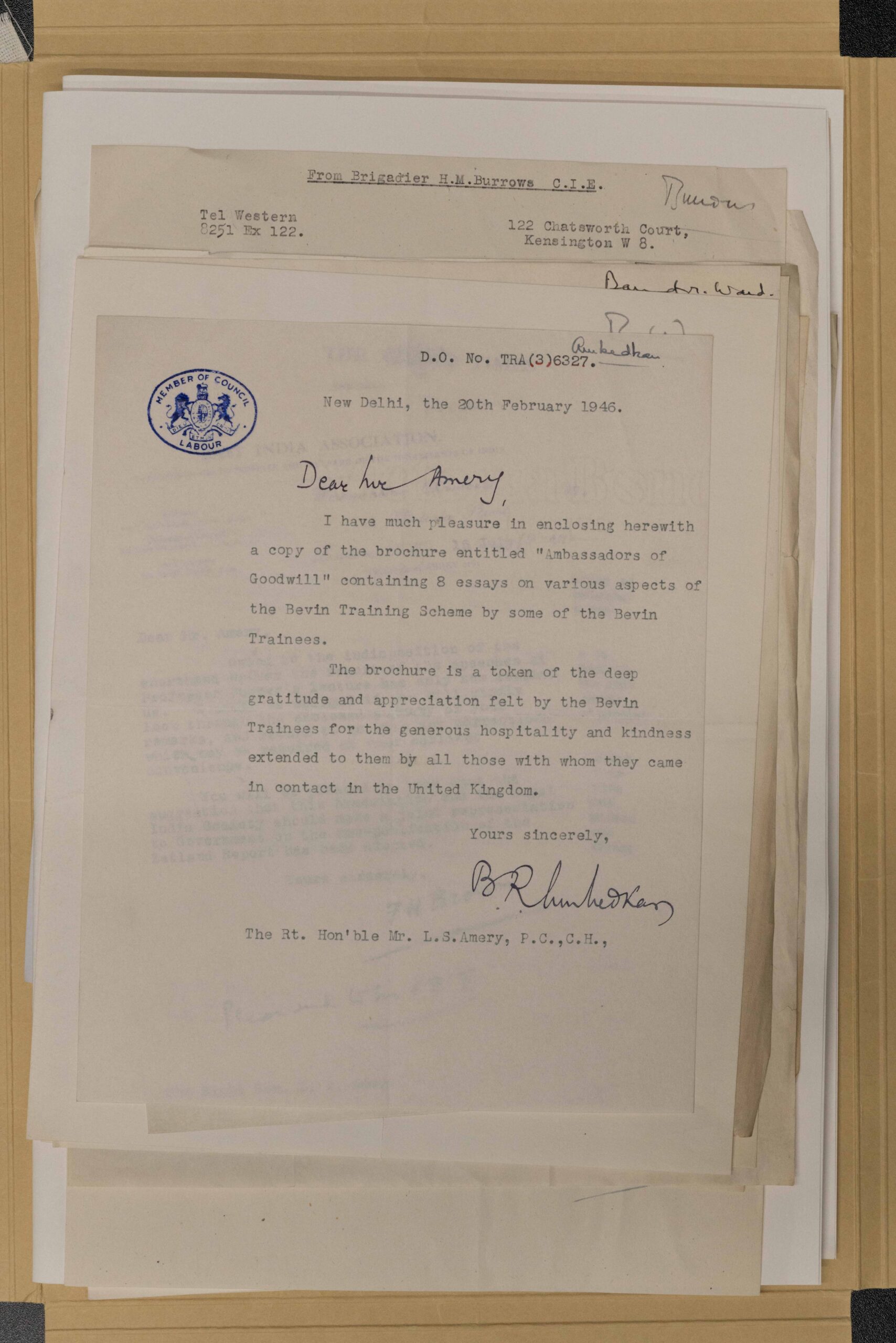 The first batch of 50, chosen from over 200 applicants, so-called Bevin Boys sailed from Bombay in February 1941. They were chosen carefully from each province that was allocated a certain quota. The scheme was to keep them in training for about six months, while living with the local working-class families. Dr Ambedkar’s associate P. S. Bakhale, from Bombay Textile Labour Union, was the head of the Tribunal overseeing the sending of the Bevin Boys[15]. Starting in 1942, Dr Ambedkar, as Labour Minister, answered several Parliamentary queries regarding the status of employment of the Bevin Boys[16]. In April 1945, in an address to the chairman of the Tribunal at Shimla, Dr Ambedkar appreciated the help that Bevin Scheme would provide for the future of India, but urged them that “if the country’s industrial expansion is to assume proportions which are being generally visualised there is need not only for the skilled workers but for qualified higher grade technicians and for men capable of undertaking the direction and management of industry.”[17] In total about 900 or so young Indian men received training in the UK under the scheme. In my search through the archives, to piece this information together, I also came across a letter of appreciation written by Dr Ambedkar in February 1946 to the then Secretary of State for India Mr Amery (see below).
