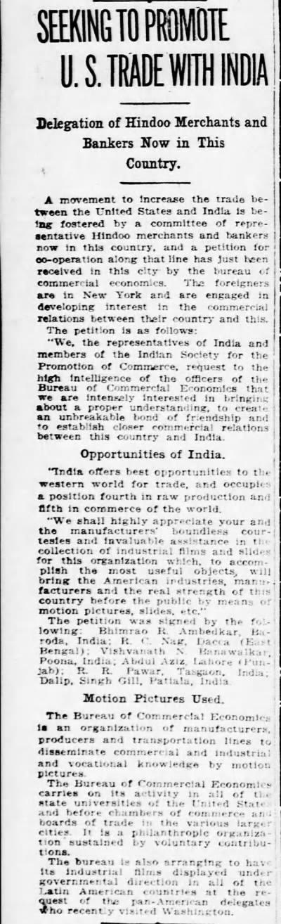 So, it happened that in June 1915, “a delegation of Hindoo merchants and bankers” found themselves in New York in order to improve trade relations with the US. As part of that effort, they signed a petition addressed to the Bureau of Commercial Economics that was “an association of the leading institutions, manufacturers, producers and transportation lines in this country [United States of America] and abroad to engage in disseminating industrial and vocational information by the graphic method of motion pictures upon the recommendation of the leading educators of the country.”[4]