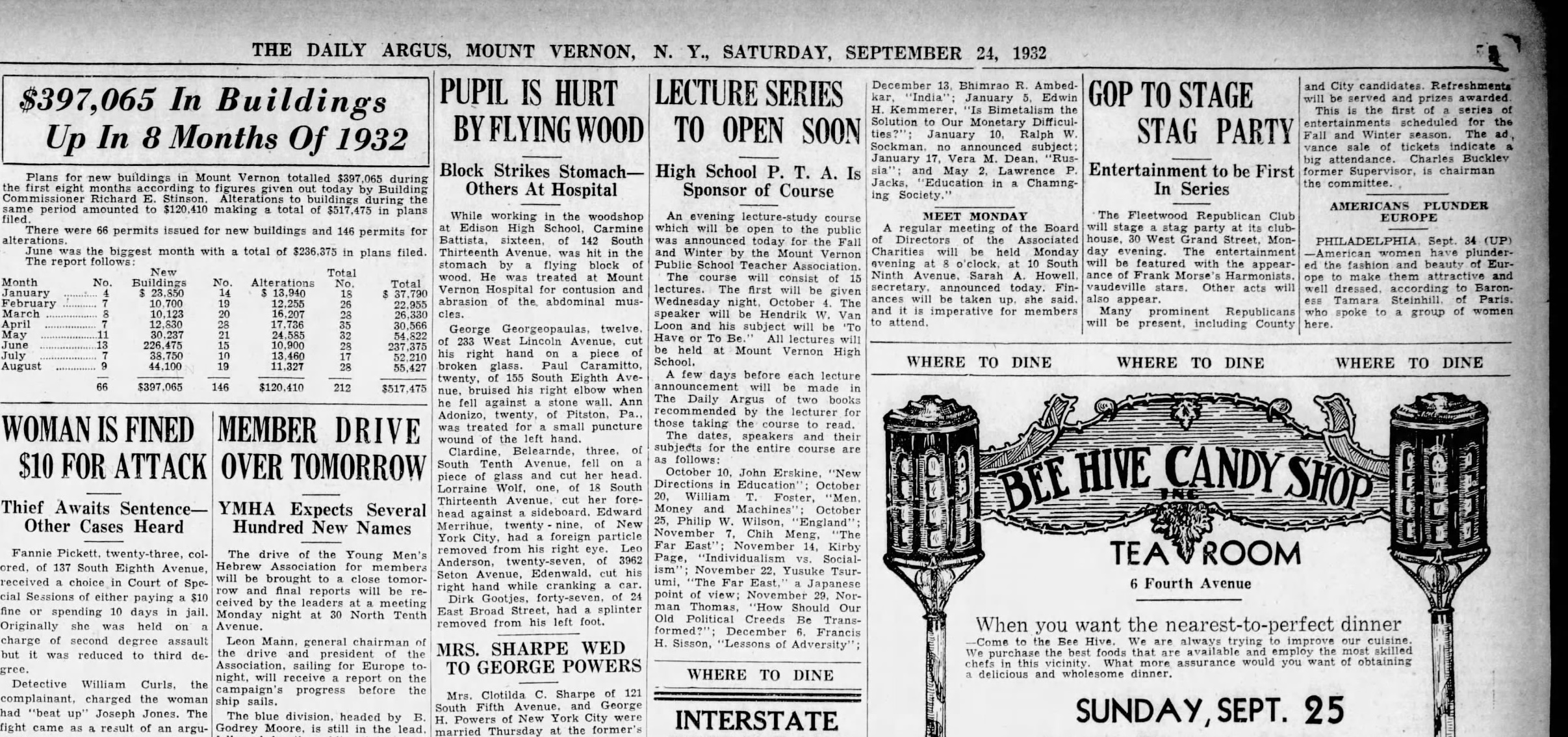 Courtesy: The Daily Argus, Mount Vernon, NY, 24 September 1932, p 3